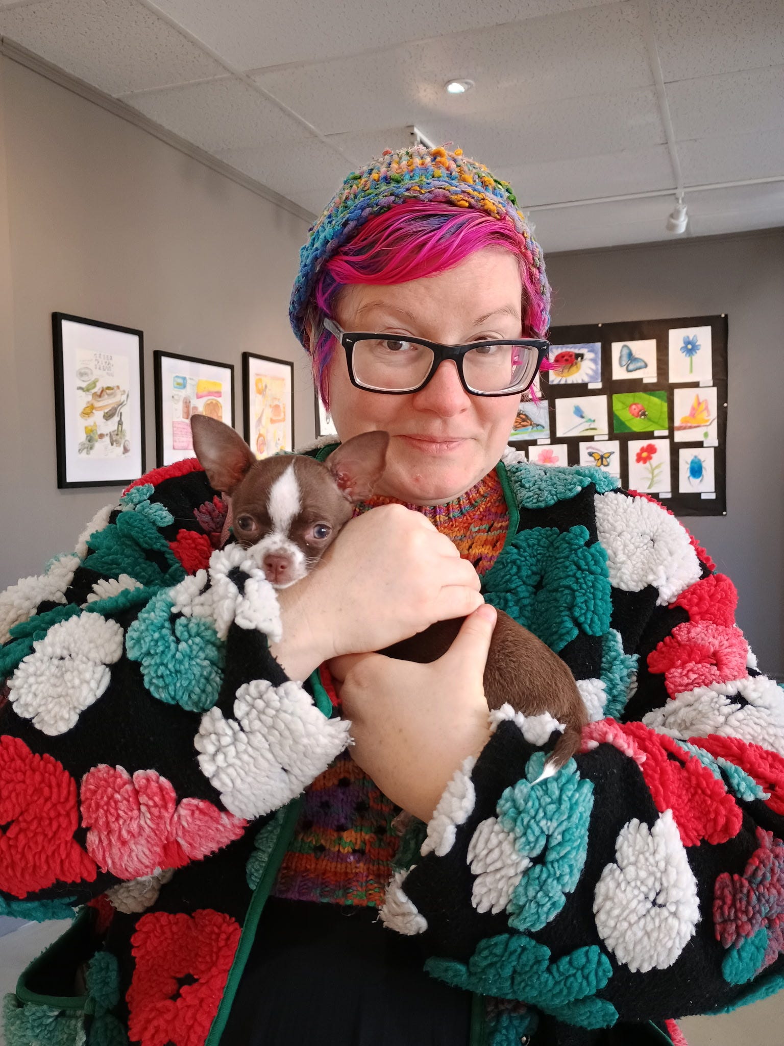 Then I went to have a chat with my friend at the gallery. And there was a tiny dog. A 3 month old chihuahua that I was allowed to hold, until she fell asleep on me.