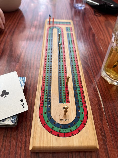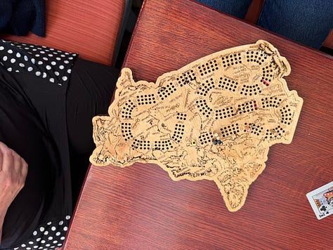 …and then a writer friend arrived, and the first wave of guests left…and my writer friend and I walked over to another cafe for cribbage.
