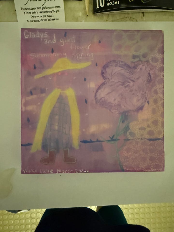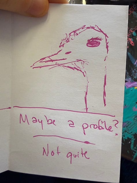 I put the garbage out at 3am was the crux of it. And I went to sleep and woke up at 11:11am, because our poor Heather with whom I make art, has the flu. But she is having a restful time at home, and I love that for her. This weeks prompts are full of birds, because she has a penchant for drawing them…and I wanted to thank her for her contagious enthusiasm. Her tiny books over the last three months has brought me an enormous amount of joy. Not just the outcome…but the process…watching her choose the prompt, then conceive of book, and if I’m lucky…having it read to me with effervescence.