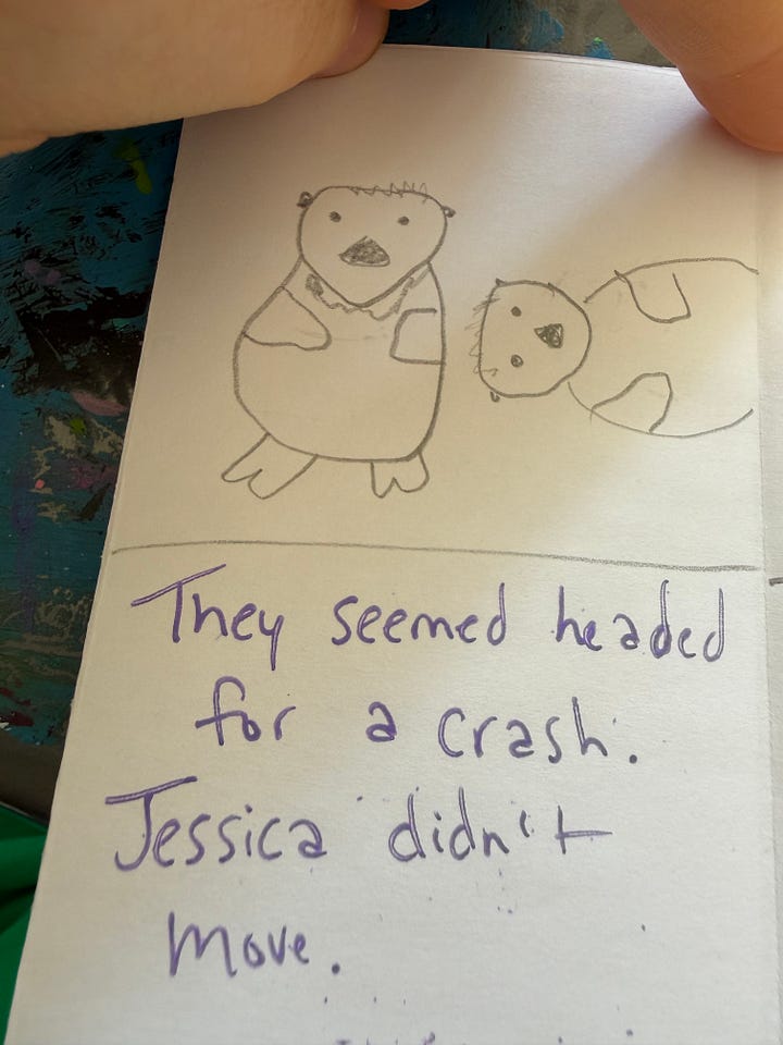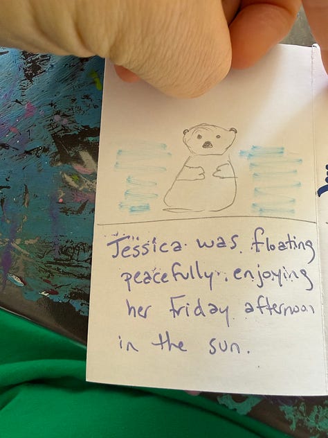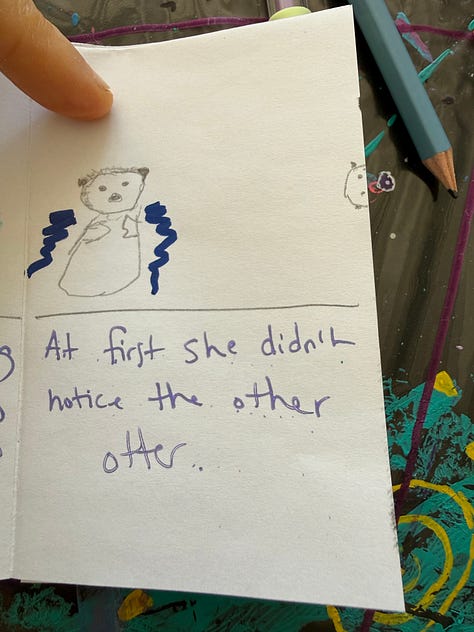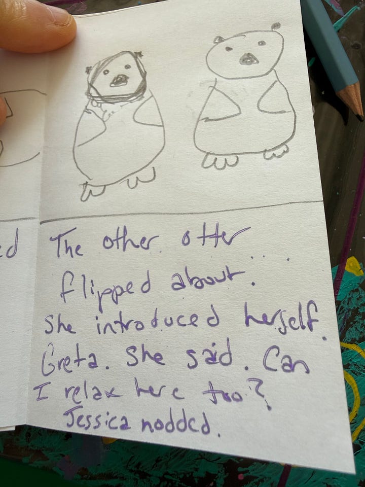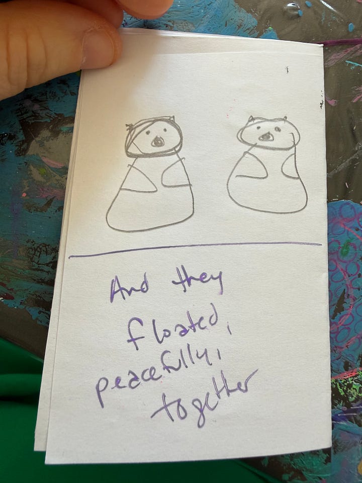 I decided to go in early to write my tiny book then play chess…but my chess partner’s pup was having some issues…and so he went home, and as he was leaving my friend and her three children arrived. She had prepared them so well…and I got to spend the morning making art, writing and playing with the four of them until a new chess player arrived.